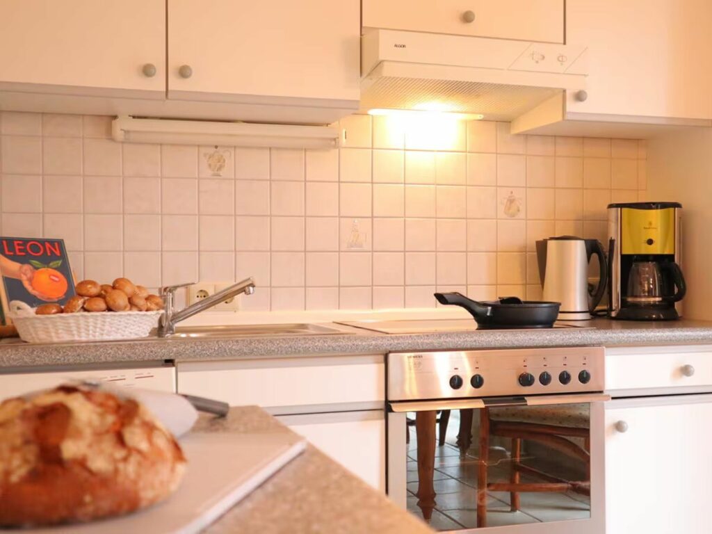 Eine Waschmaschine befindet sich im Badezimmer. Auch ein Bügeleisen, Bügelbrett und Wäscheständer sind vorhanden und auf Nachfrage sind ein Babybett, Kinderhochstuhl oder weitere Hilfsmittel möglich.